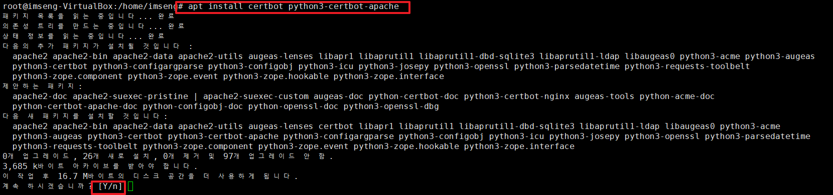 - Let's Encrypt 인증서를 설치하고 자동으로 갱신시켜 주는 certbot과 python3-certbot-apache 설치