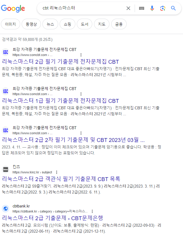 - CBT 리눅스마스터라는 키워드로 검색하시면 여러 사이트에서 기출문제를 공부하실 수 있습니다.