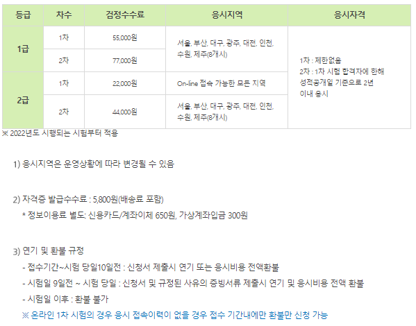 - 1급은 1차 필기, 2차 필기+실기로 구성되어 있습니다.