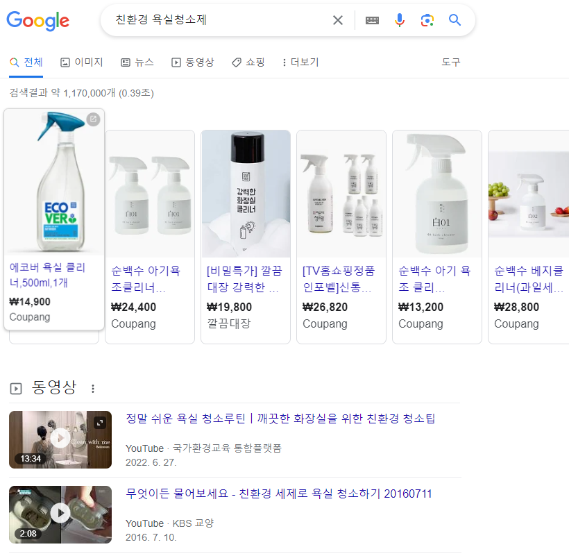 실험을 위해 친환경 욕실청소제로 검색을 해보도록 하겠습니다.