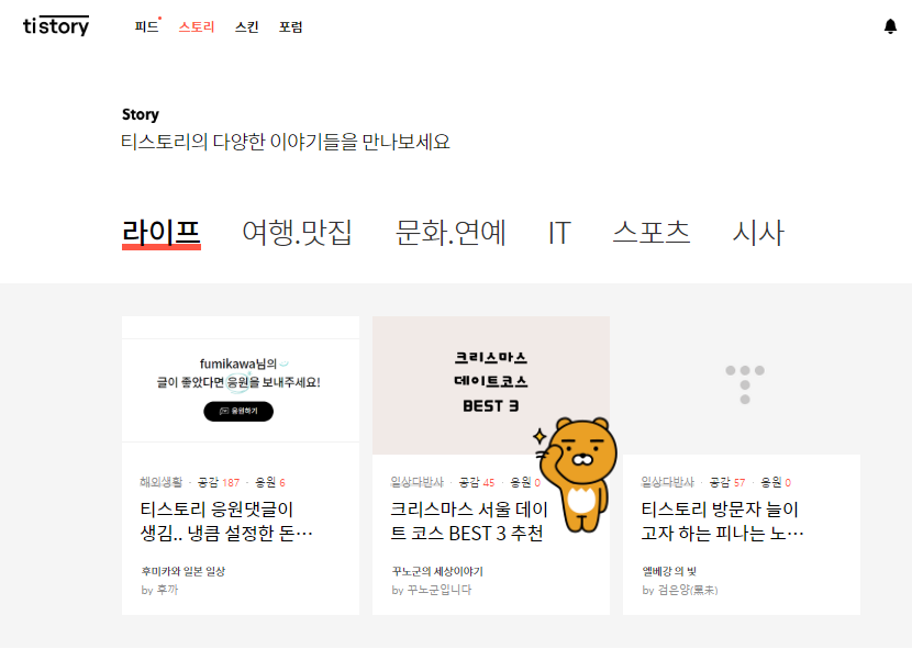 티스토리 홈페이지 메인에 보이는 '크리스마스 데이트코스 BEST 3'를 클릭해 보았습니다...