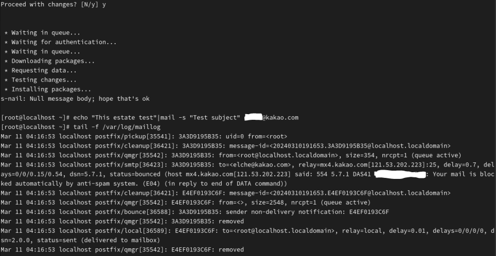 - 설치가 완료된 후 다시 echo "Test email body" | mail -s "Test Email Subject" your_email@example.com 메시지 전송 시도