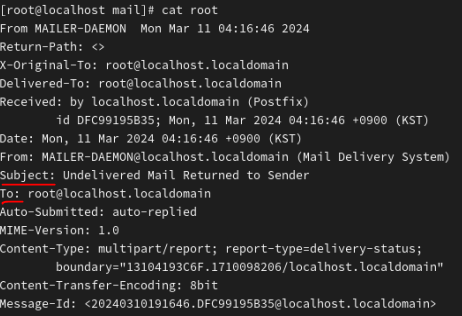 - 저는 해당 메시지가 왔습니다. 뭔가 싶어서 메일통에 들어가면 본인 계정과 root 계정이 보입니다.