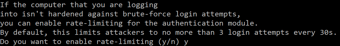 로그인 중인 컴퓨터가 무차별 로그인 시도에 대해 강화되지 않은 경우 인증 모듈에 대해 속도 제한을 활성화할 수 있습니다. 기본적으로 이는 공격자가 30초마다 로그인 시도를 3회 이하로 제한합니다. 속도 제한을 활성화하시겠습니까(y/n)?